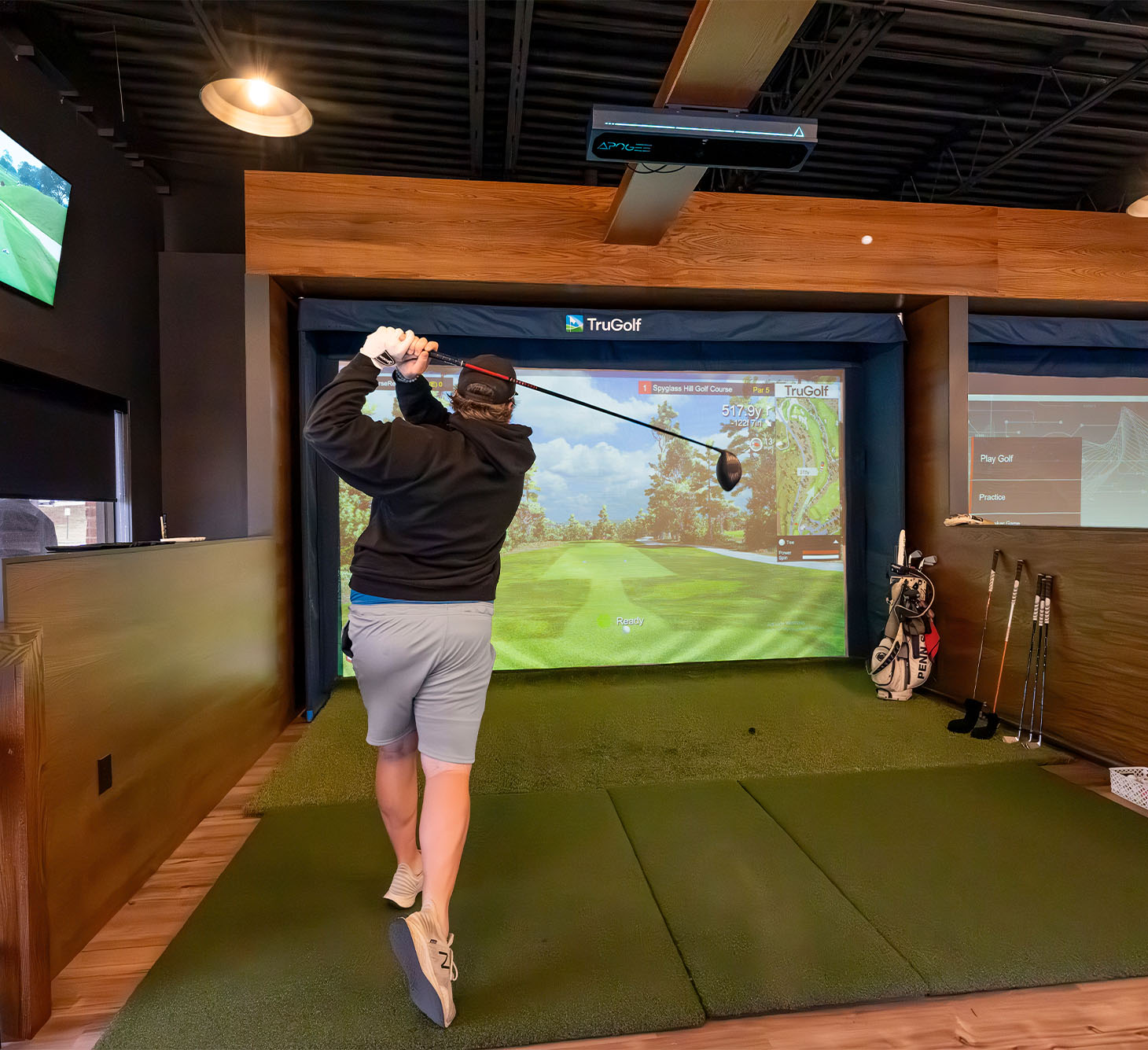 Explore the front entrance of Divots and get your first look at our Topgolf-powered simulator bays — where your next round begins in comfort and cutting-edge tech.